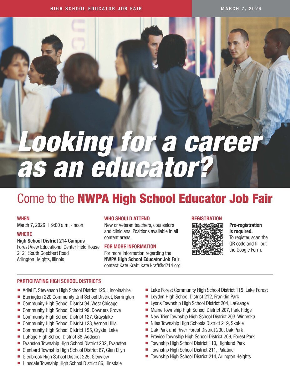 To those interested in a career in high school education, District 207 will be attending the NWPA High School Educator Job Fair on Saturday, March 7 from 9 a.m. to noon at the High School District 214 Campus. Full details are available in the flyer below.