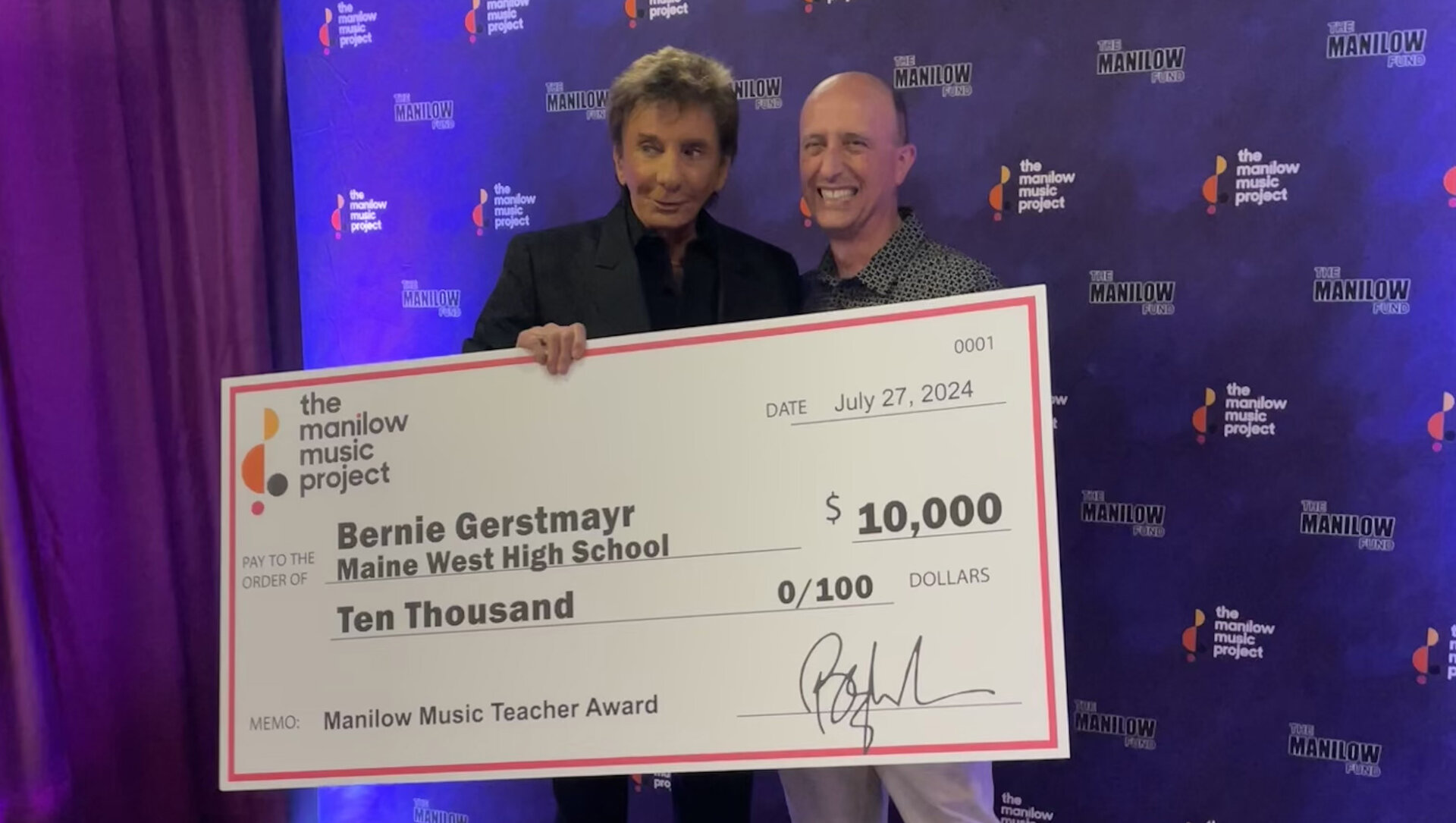 Gerstmayr met Manilow before the show to receive the award, and during the show, Manilow shared ways in which Gerstmayr has, and continues to, enrich the lives of music students at Maine West High School.